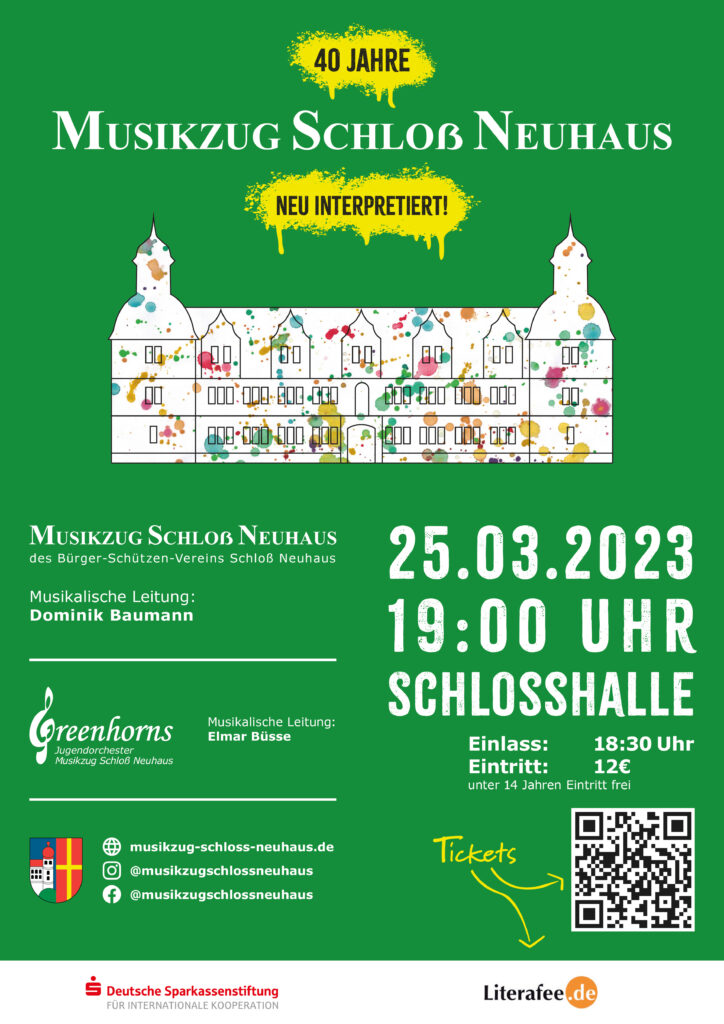 links: Konzertplakat des ausverkauften Jubiläumskonzerts des Musikzug Schloß Neuhaus